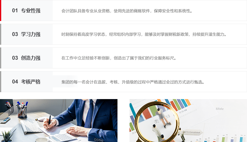 我的企業(yè)提供的財務服務,都是基于多年創(chuàng)新經驗總結出的科學流程和做賬標準,保證服務精細,數據精準、專業(yè)高效。